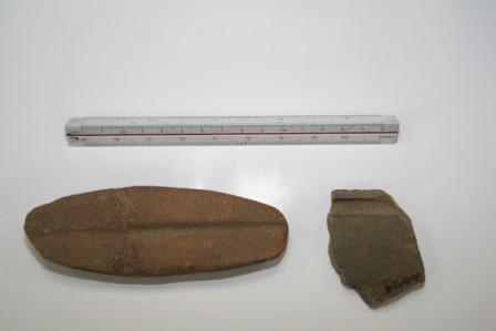 上層 縄文を施した深鉢型土器や削器、打製石鏃、局部磨製石鏃、小型磨製石斧