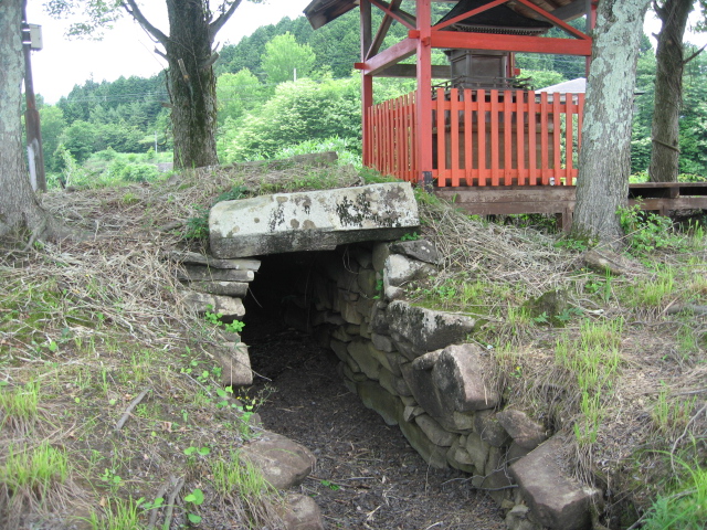 氷坂古墳群では昭和33年に発掘調査が行われ刀子・鉄鏃・金環一対・瑪瑙製コの字勾玉などが発見された三号古墳と25mほど離れた井上神明神社の社殿下にある未発掘の氷坂二号古墳を近くで見ることができます。