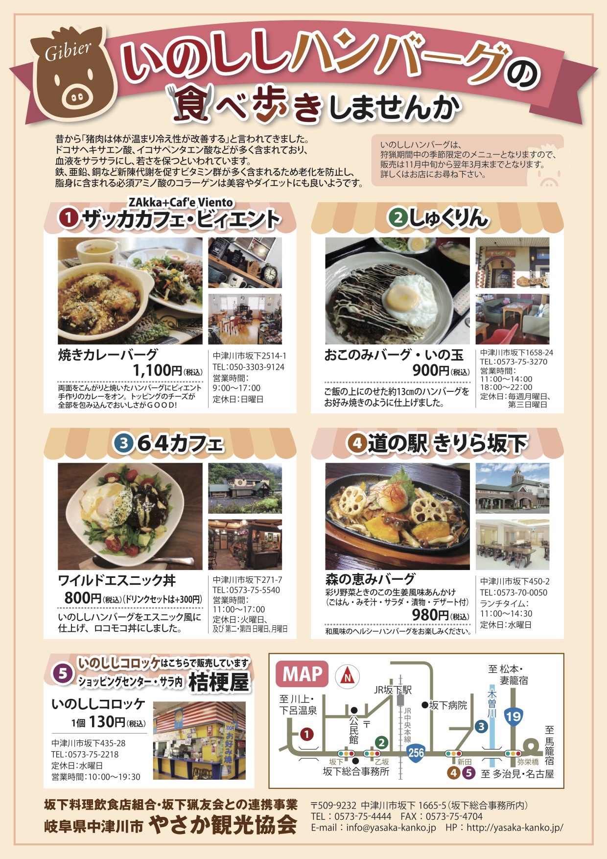 近年、猪による農作物の被害は深刻な問題となっています、ハンターが捕獲した猪の販路を開拓して1頭でも多く捕獲して頂き、猪肉を観光客の少ない冬季に飲食店で目玉商品として販売しようと、やさか観光協会では、料理飲食店組合と猟友会との連携により、「いのししハンバーグの食べ歩き」を企画しました。
